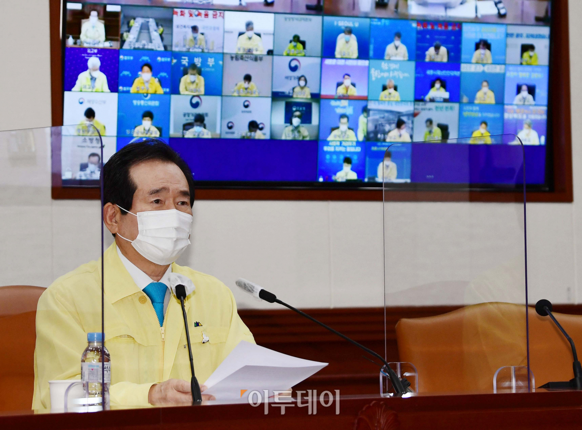 정세균 국무총리가 13일 서울 종로구 정부서울청사에서 열린 코로나19 대응 중앙재난안전대책본부 회의에서 모두발언을 하고 있다.