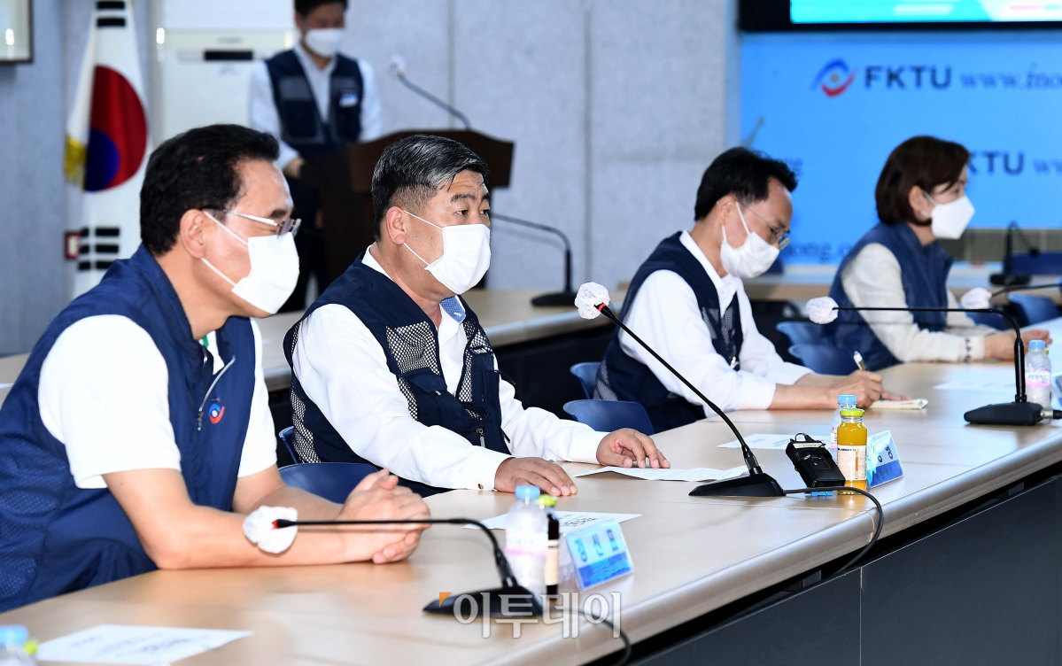 김동명 한국노동조합총연맹 위원장이 14일 서울 여의도 한국노총에서 열린 ‘이낙연 더불어민주당 대표 취임 인사 및 한국노총 방문 간담회’에서 인사말을 하고 있다.