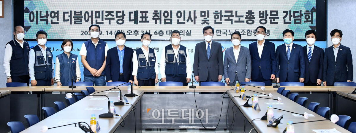 이낙연 더불어민주당 대표와 김동명 한국노동조합총연맹 위원장 등이 14일 서울 여의도 한국노총에서 열린 ‘이낙연 더불어민주당 대표 취임 인사 및 한국노총 방문 간담회’에 앞서 기념촬영을 하고 있다.