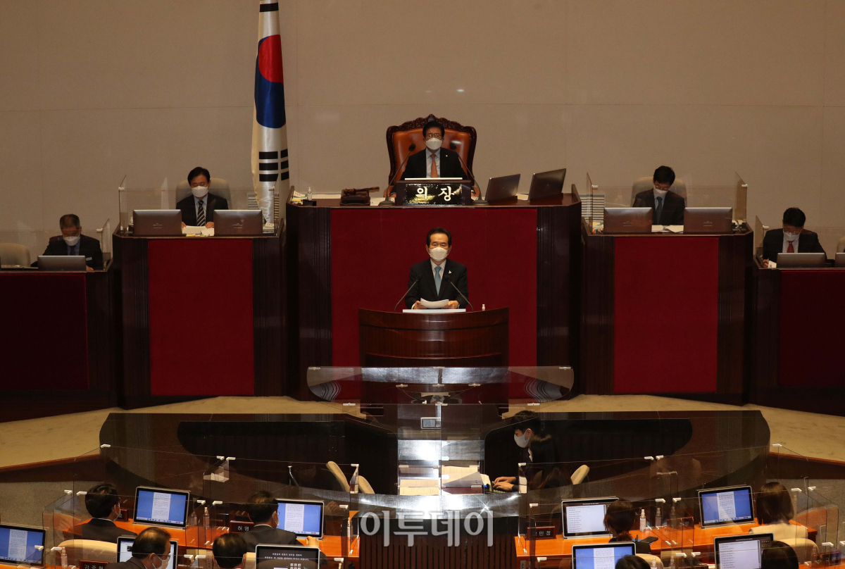 정세균 국무총리가 14일 오후 서울 여의도 국회에서 2020년도 제4회 추가경정예산안에 대한 정부의 시정연설을 하고 있다.