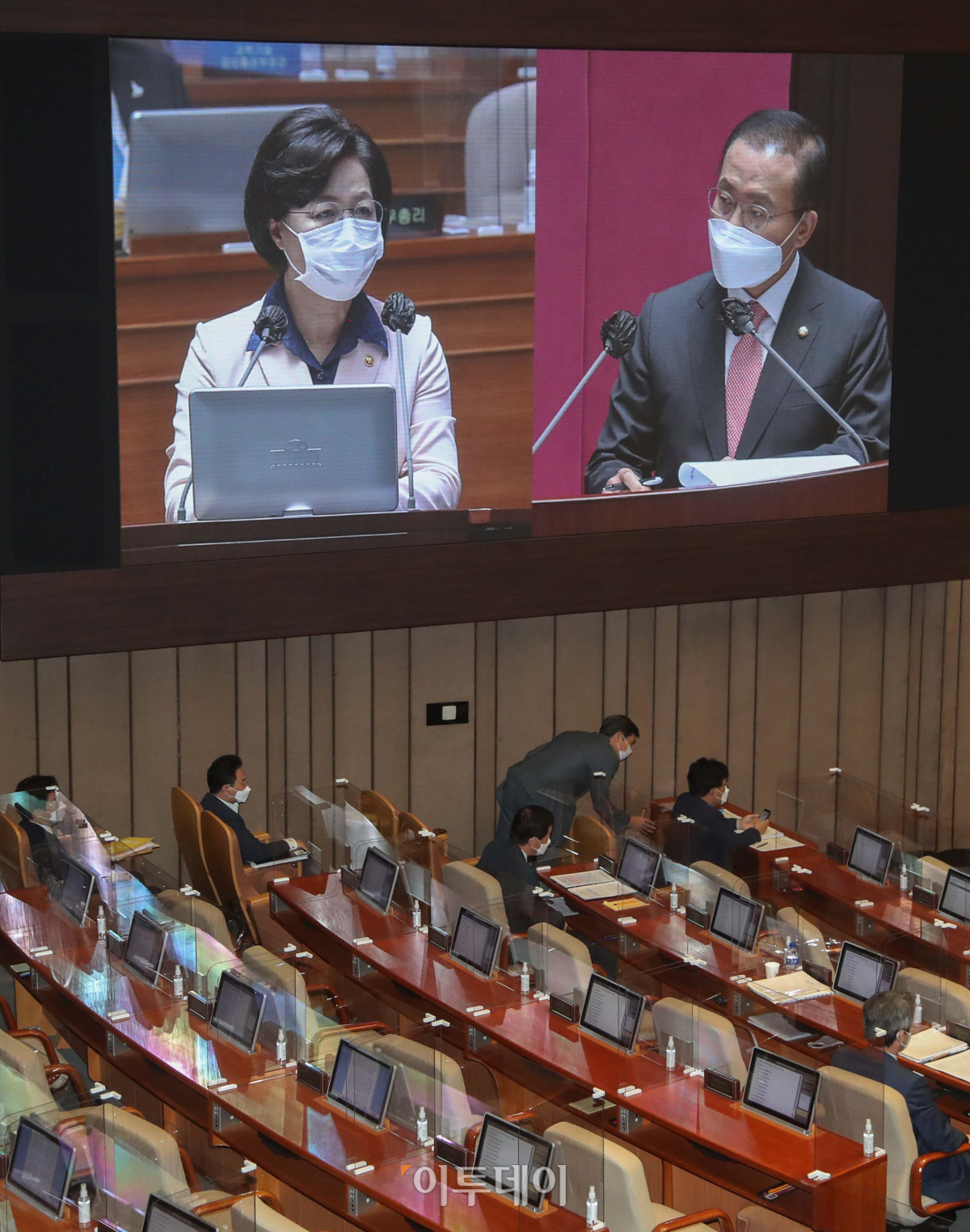 윤재옥 국민의힘 의원이 14일 오후 서울 여의도 국회 본회의장에서 열린 정치 분야 대정부질문에서 추미애 법무부 장관에게 아들의 군 복무 중 휴가 특혜 의혹에 대해 질문하고 있다.