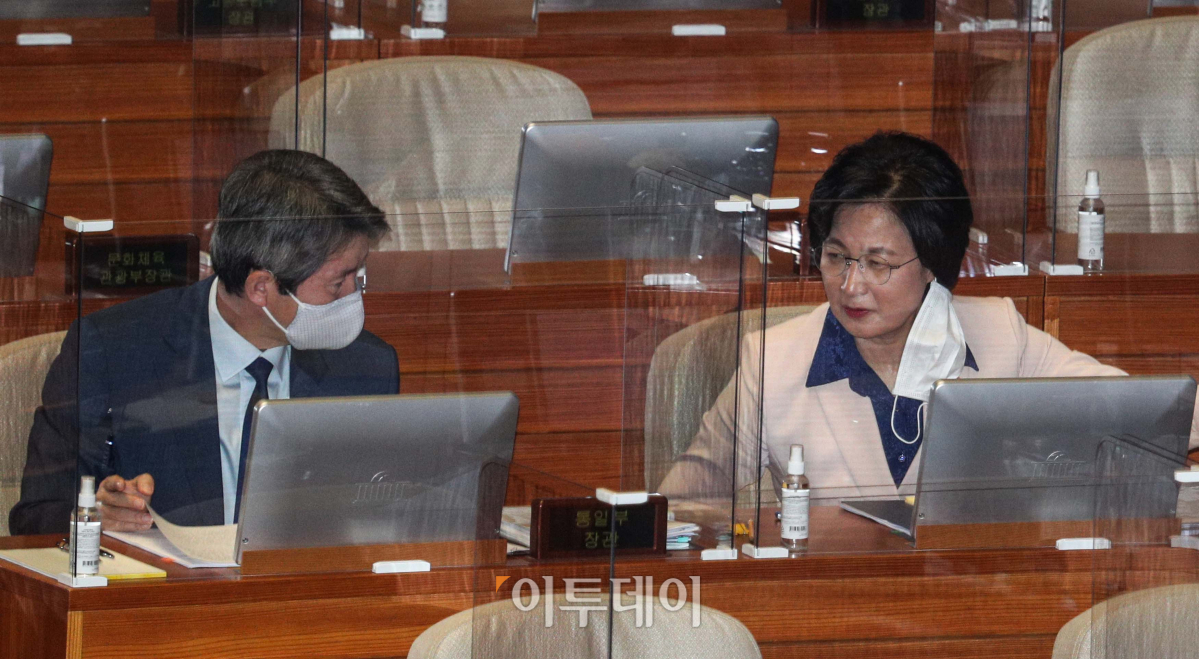 추미애 법무부 장관과 이인영 통일부 장관이 14일 오후 서울 여의도 국회에서 열린 본회의에서 대화를 나누고 있다.