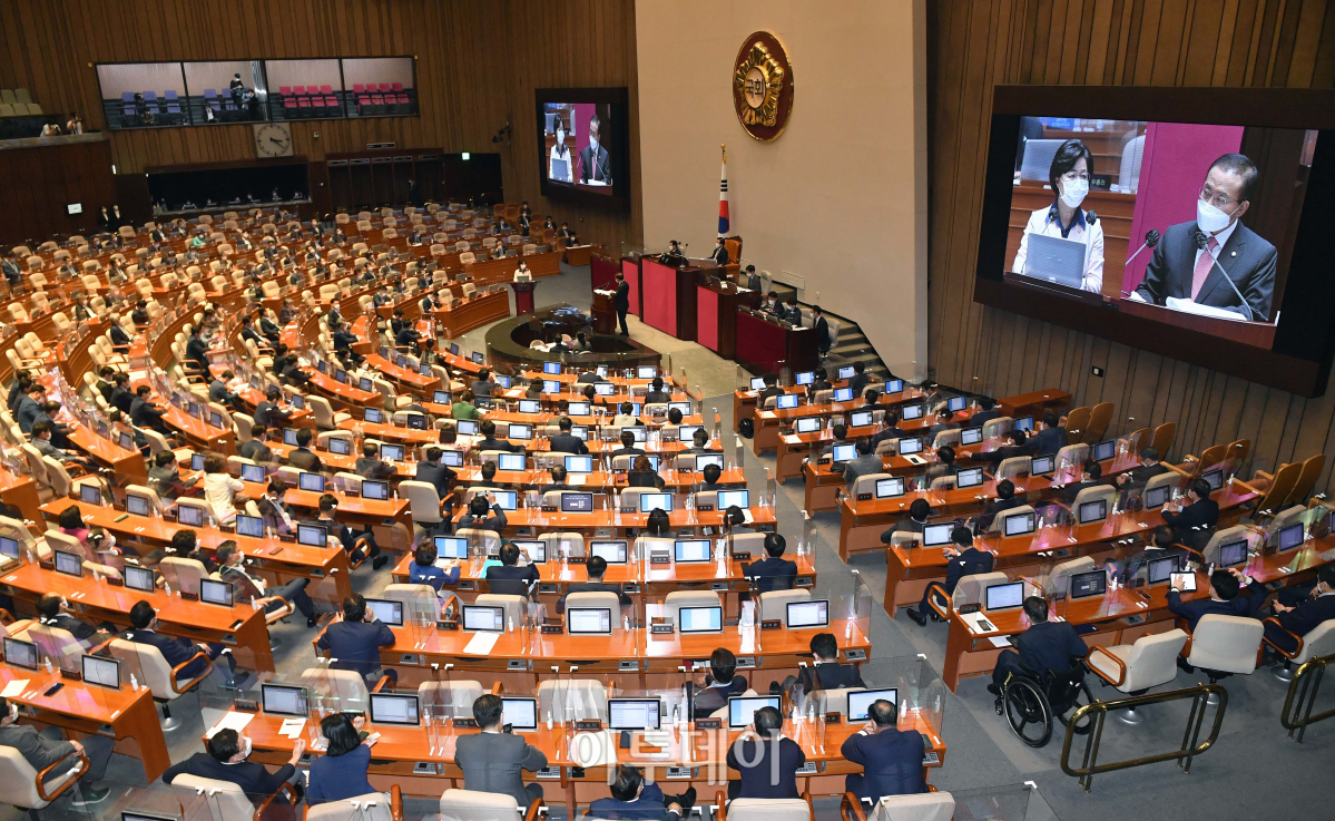 추미애 법무부 장관이 14일 서울 여의도 국회 본회의장에서 열린 정치분야 대정부질문에서 의원 윤재옥 국민의힘 의원 질문에 답변하고 있다.