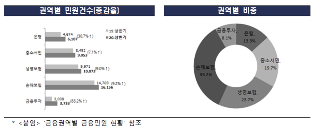 14일 금융감독원에 따르면 상반기 금융민원 접수건수는 총 4만5922건으로 전년동기(3만9924건) 대비 15%(5998건) 증가했다. 은행(1433건, 30.7%↑), 중소서민(601건, 7.1%↑), 생보(902건, 9.0%↑), 손보(1367건, 9.2%↑), 금투(1695건, 83.2%↑) 등 전 권역에서 상승했다.