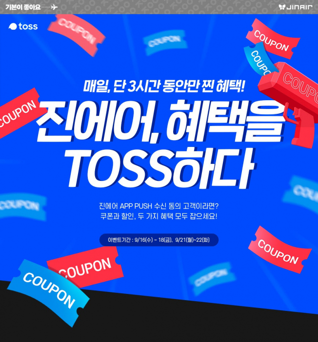 진에어는 토스와 협력해 기획한 '진에어 혜택을 toss하다’ 이벤트를 선보일 예정이라고 15일 밝혔다.