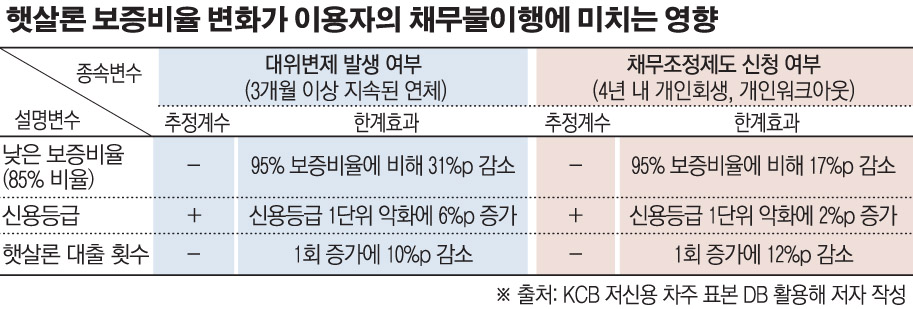 보고서는 정책서민금융상품이 서민 차주의 채무구조·신용에 오히려 부정적인 영향을 미치는 배경 중 하나로 지나치게 높은 보증비율 수준을 지적했다. 보증비율이 높을수록 대출기관은 연체 발생 시 손실이 작아진다. 이는 대출기관의 심사·관리기능 약화를 초래할 수 있다. 실제 햇살론의 보증비율이 85%였을 때 대위변제 발생 및 채무조정제도 신청 비율은 보증비율이 95%였을 때보다 각각 31%포인트(P), 17%P 낮았던 것으로 나타났다. 이는 신용등급 개선 효과(1단위당 6%P)보다 큰 수준이다. 특히 보증비율이 대위변제 및 채무조정제도에 미치는 영향은 상호금융권보다 대출모집인 기반의 저축은행에서 발급된 대출에서 확연히 컸다.