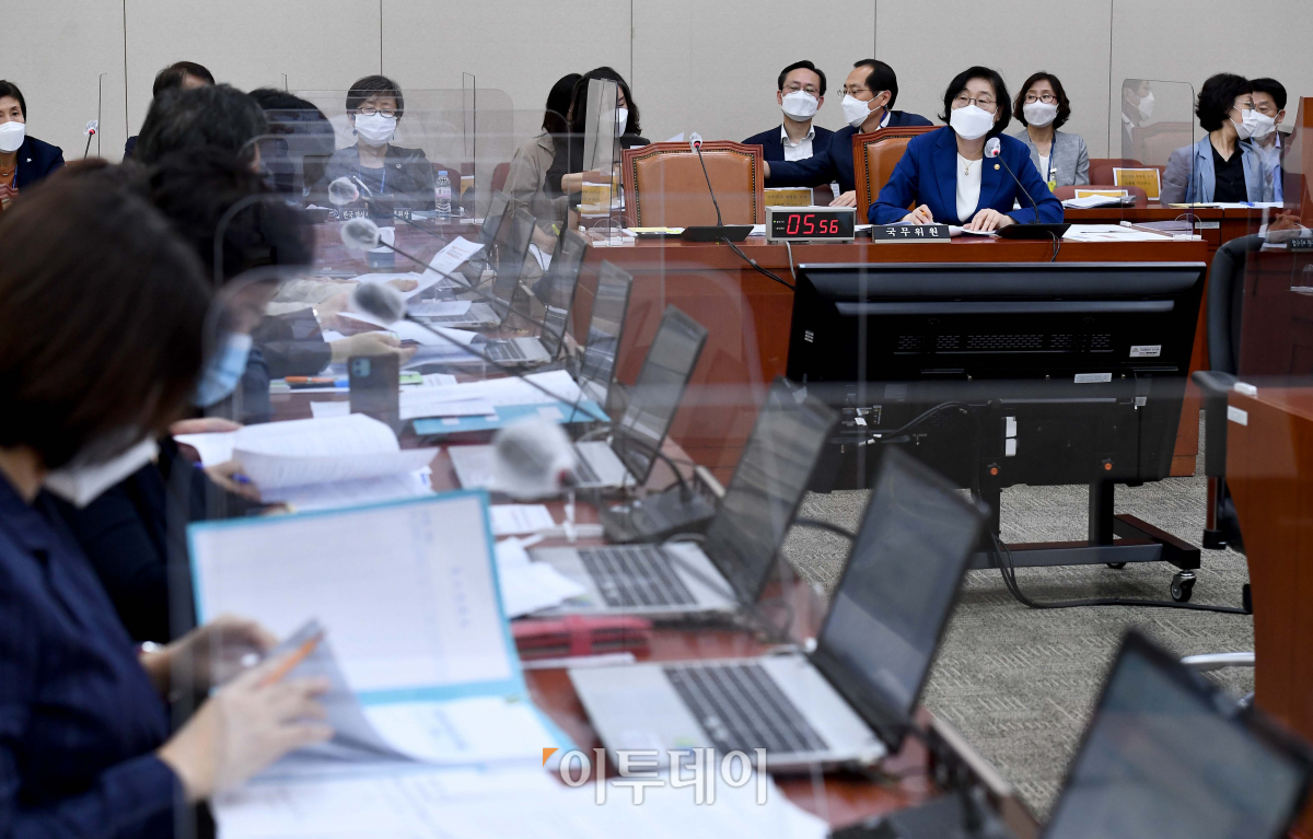 이정옥 여성가족부 장관이 15일 서울 여의도 국회에서 열린 여성가족위원회 전체회의에서 의원의 질의에 답하고 있다.