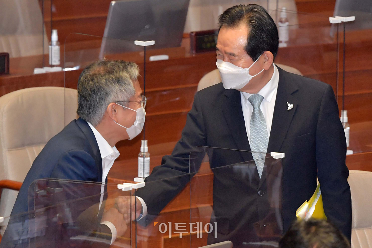 정세균 국무총리와 최강욱 열린민주당 대표가 15일 오후 서울 여의도 국회에서 열린 본회의에서 인사하고 있다.
