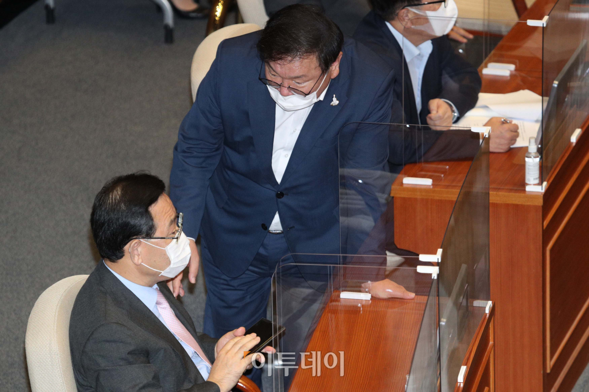 김태년 더불어민주당 원내대표와 주호영 국민의힘 원내대표가 15일 오후 서울 여의도 국회에서 열린 외교·통일·안보 분야 대정부질문에서 대화를 하고 있다.