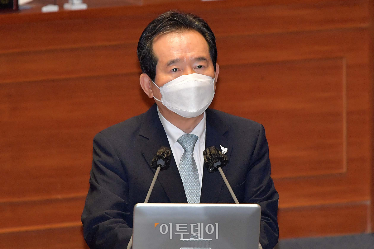 정세균 국무총리가 15일 오후 서울 여의도 국회에서 열린 본회의에서 박진 국민의힘 의원의 질의에 답하고 있다.