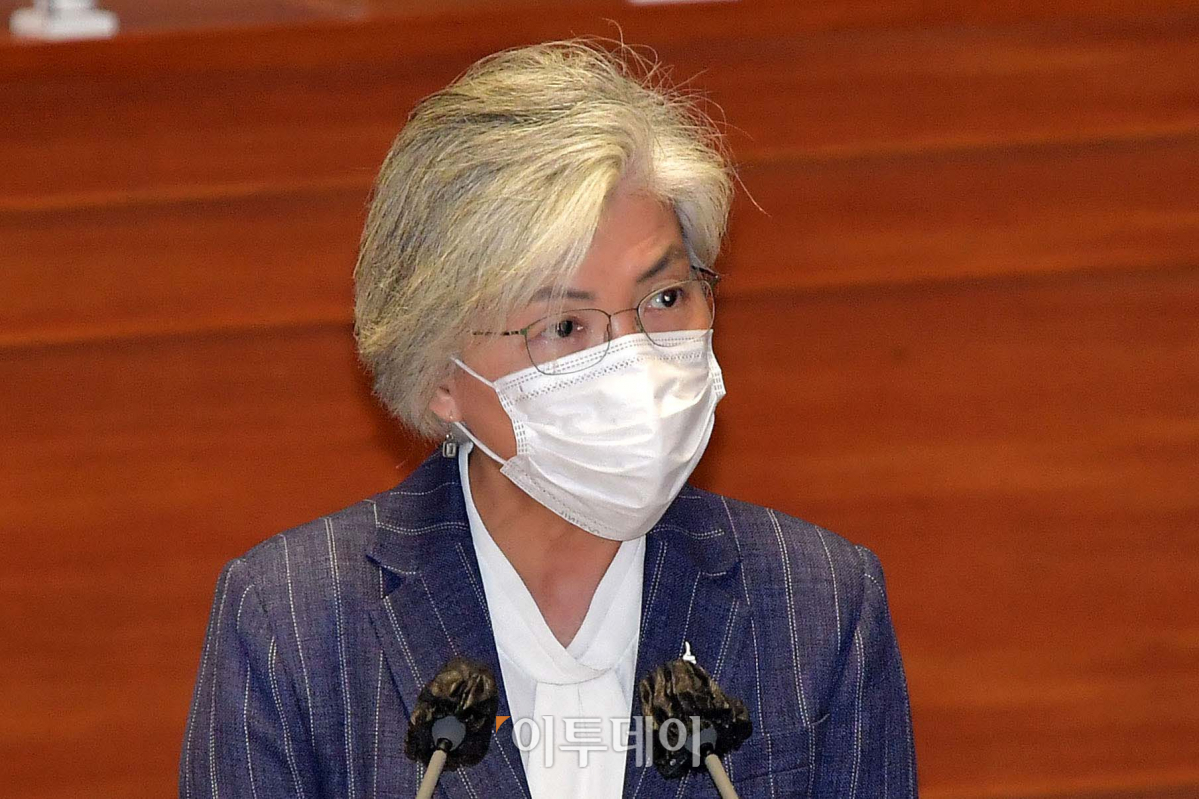 강경화 외교부 장관이 15일 오후 서울 여의도 국회에서 열린 본회의에서 국민의힘 박진 의원의 대정부 질의에 답하고 있다.