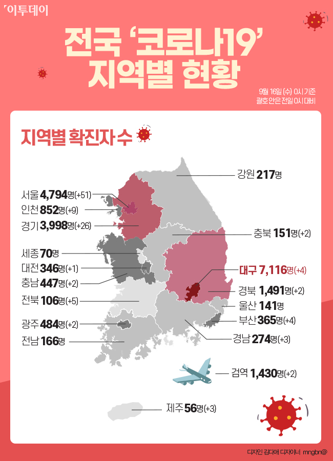 이로써 전국 시·도별 '코로나19' 확진자 수는 △대구 7116명 △서울 4794명으로 가장 많은 비중을 차지했다. 이어 △경기 3998명 △경북 1491명 △검역소 1430명 △인천 852명 △광주 484명 △충남 447명 △부산 365명 △대전 346명 △경남 274명 △강원 217명 △전남 166명 △충북 151명 △울산 141명 △전북 106명 △세종 70명 △제주 56명 순으로 나타났다.