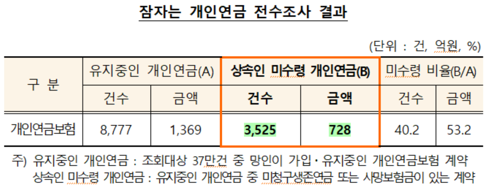 조사대상 37만건 중 망인이 가입․유지 중인 개인연금보험 계약은 8777건이며, 이중 상속인이 찾아가지 않은 계약은 3525건, 미지급된 보험금은 728억 원(건당 평균 2000만 원)으로 조사됐다.