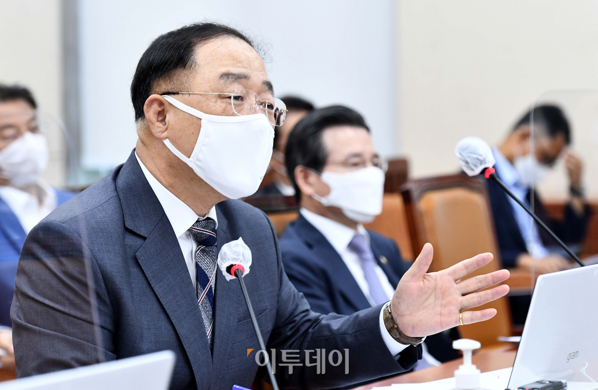 홍남기 부총리 겸 기획재정부 장관이 16일 서울 여의도 국회에서 열린 기획재정위원회 전체회의에서 의원의 질의에 답하고 있다.