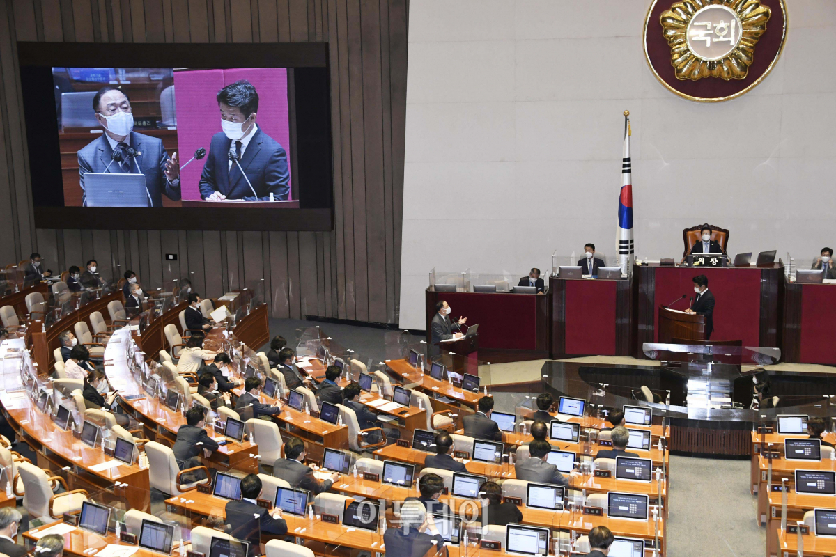 16일 국회에서 열린 경제분야 대정부질문에서 홍남기 부총리가 유의동 국민의힘 의원의 질의에 답변 하고 있다.