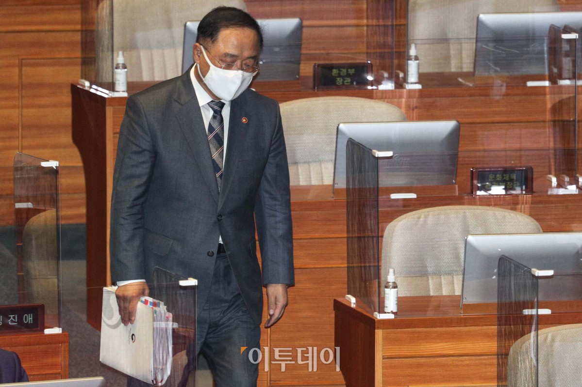홍남기 부총리 겸 기획재정부 장관이 16일 오후 서울 여의도 국회 본회의장에서 열린 경제분야 대정부질문에 참석하고 있다.
