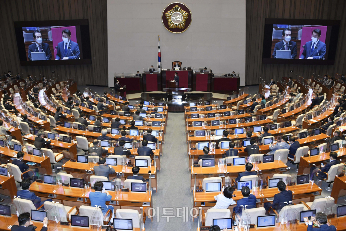 16일 국회에서 열린 경제분야 대정부질문에서 정세균 총리가 김교흥 더불어민주당 의원의 질문에 답하고 있다.