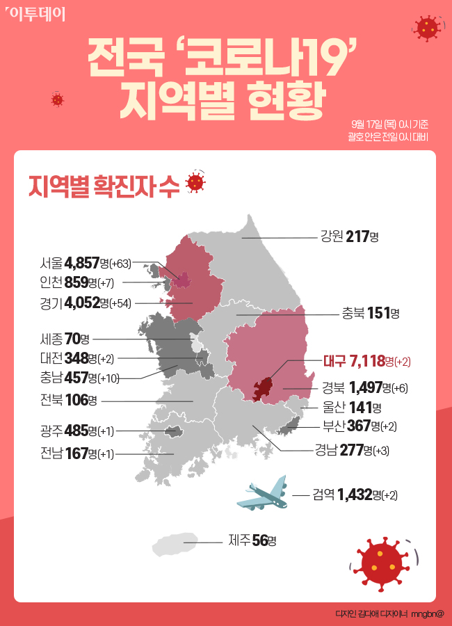 이로써 전국 시·도별 '코로나19' 확진자 수는 △대구 7118명 △서울 4857명으로 가장 많은 비중을 차지했다. 이어 △경기 4052명 △경북 1497명 △검역소 1432명 △인천 859명 △광주 485명 △충남 457명 △부산 367명 △대전 348명 △경남 277명 △강원 217명 △전남 167명 △충북 151명 △울산 141명 △전북 106명 △세종 70명 △제주 56명 순으로 나타났다.