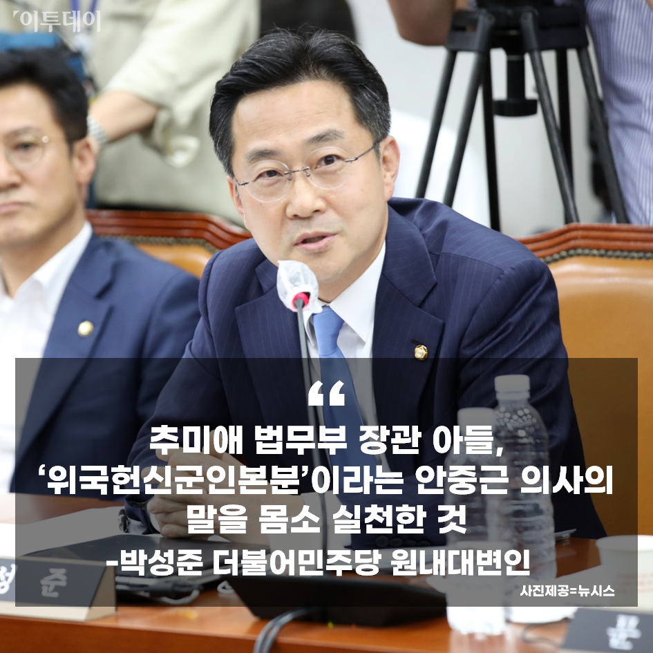 더불어민주당 박성준 원내대변인이 추미애 법무부 장관의 아들 서모 씨에 대해 "'나라를 위해 몸을 바치는 것이 군인의 본분'(위국헌신군인본분·爲國獻身軍人本分)이라는 안중근 의사의 말을 몸소 실천한 것"이라고 말했습니다. 박성준 대변인은 16일 논평을 통해 "야당은 가짜 뉴스로 국방의 의무를 다한 군 장병의 명예를 심각하게 훼손했다"며 이같이 밝혔는데요. 또한 "오로지 민생을 위해야 할 대정부질문이 연이어 추 장관 아들 청문회로 변질되고, 오늘 열리는 서욱 국방부 장관 후보자 인사청문회에서도 추 장관 아들에 대한 실체 없는 정쟁이 계속되고 있다"고 지적하기도 했습니다.