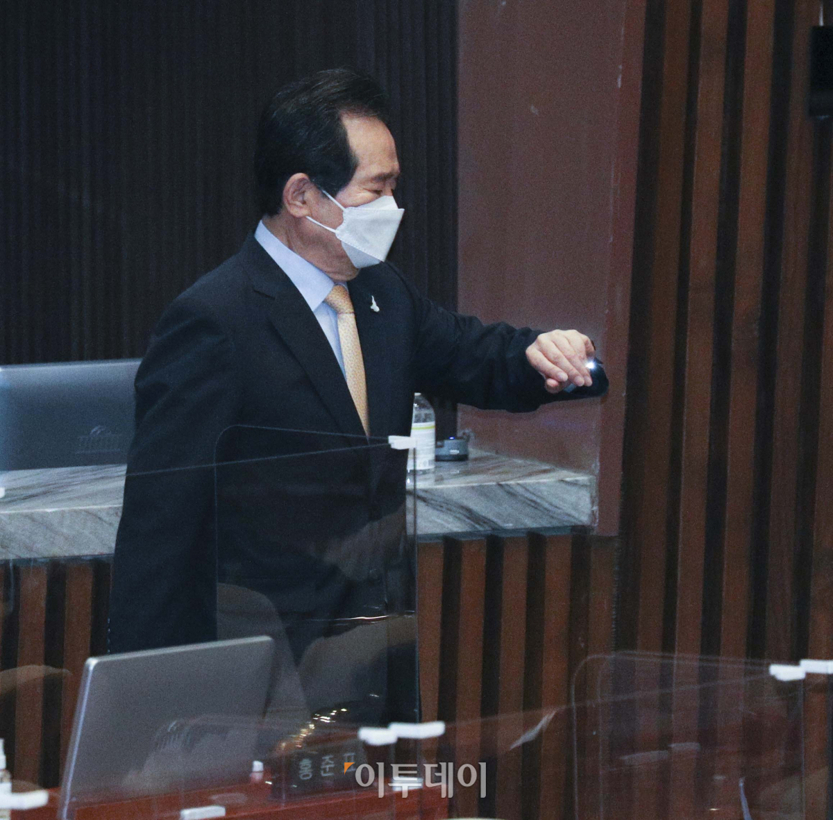 정세균 국무총리가 17일 오후 국회 본회의장에서 열린 교육 사회 문화 분야 대정부 질문에 시계를 보며 참석하고 있다.