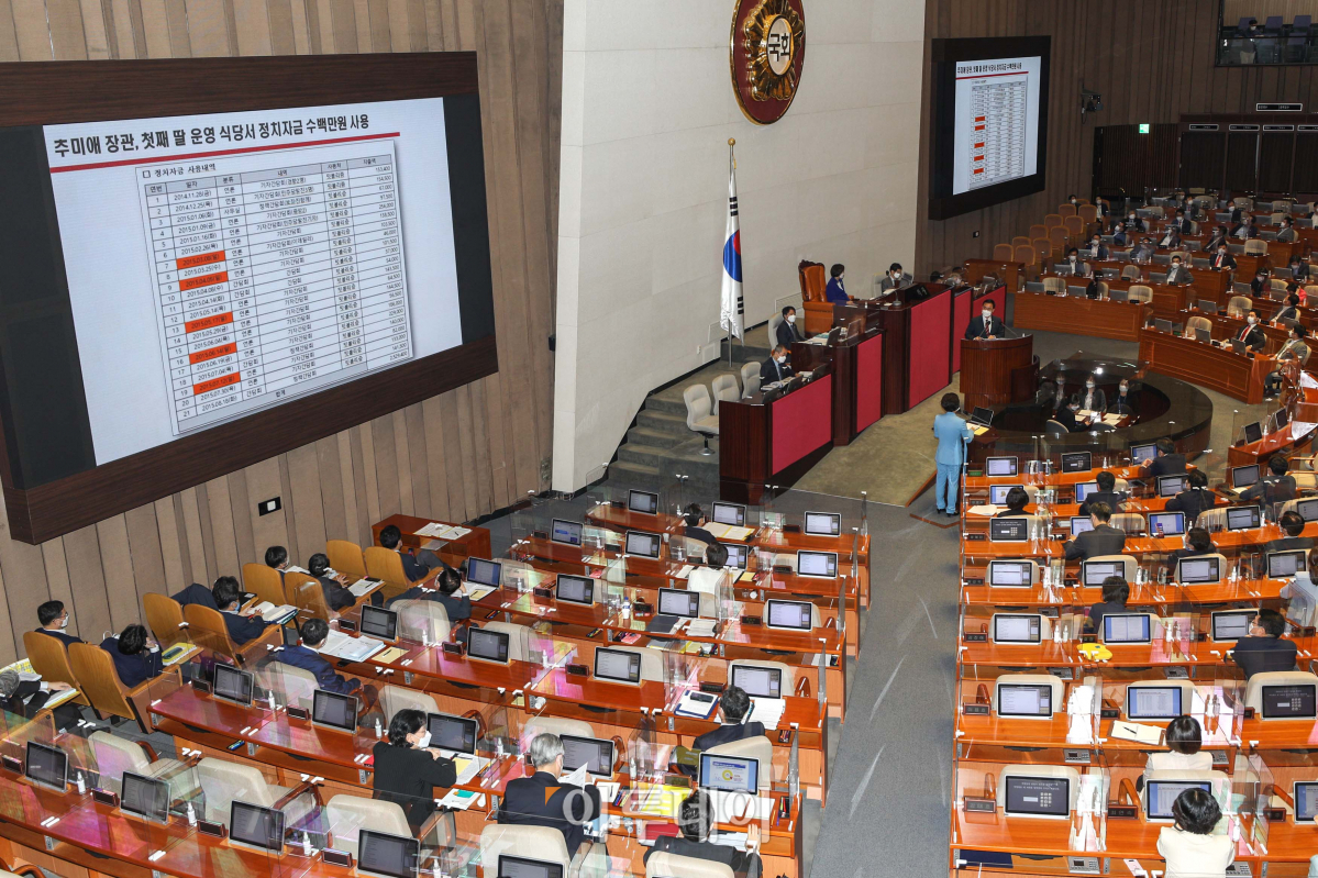 최형두 국민의힘 의원이 17일 오후 서울 여의도 국회 본회의장에서 열린 교육·사회·문화 분야 대정부질문에서 추미애 법무부 장관과 질의응답을 하던 중 추 장관이 주말에 큰 딸이 운영하는 식당에서 기자들과 간담회를 했다며 해당 자료를 공개하고 있다.