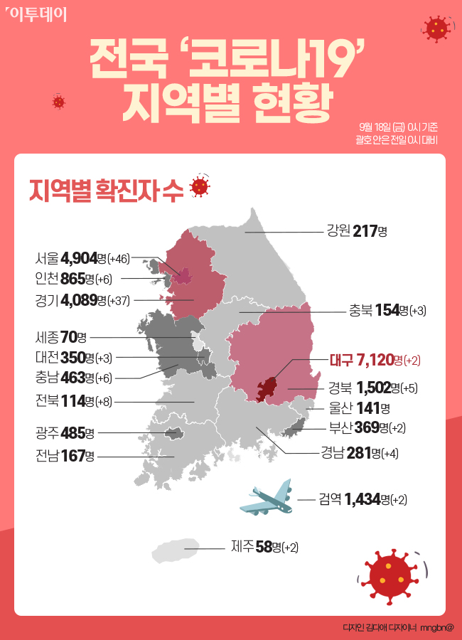 이로써 전국 시·도별 '코로나19' 확진자 수는 △대구 7120명 △서울 4904명으로 가장 많은 비중을 차지했다. 이어 △경기 4089명 △경북 1502명 △검역소 1434명 △인천 865명 △광주 485명 △충남 463명 △부산 369명 △대전 350명 △경남 281명 △강원 217명 △전남 167명 △충북 154명 △울산 141명 △전북 114명 △세종 70명 △제주 58명 순으로 나타났다.