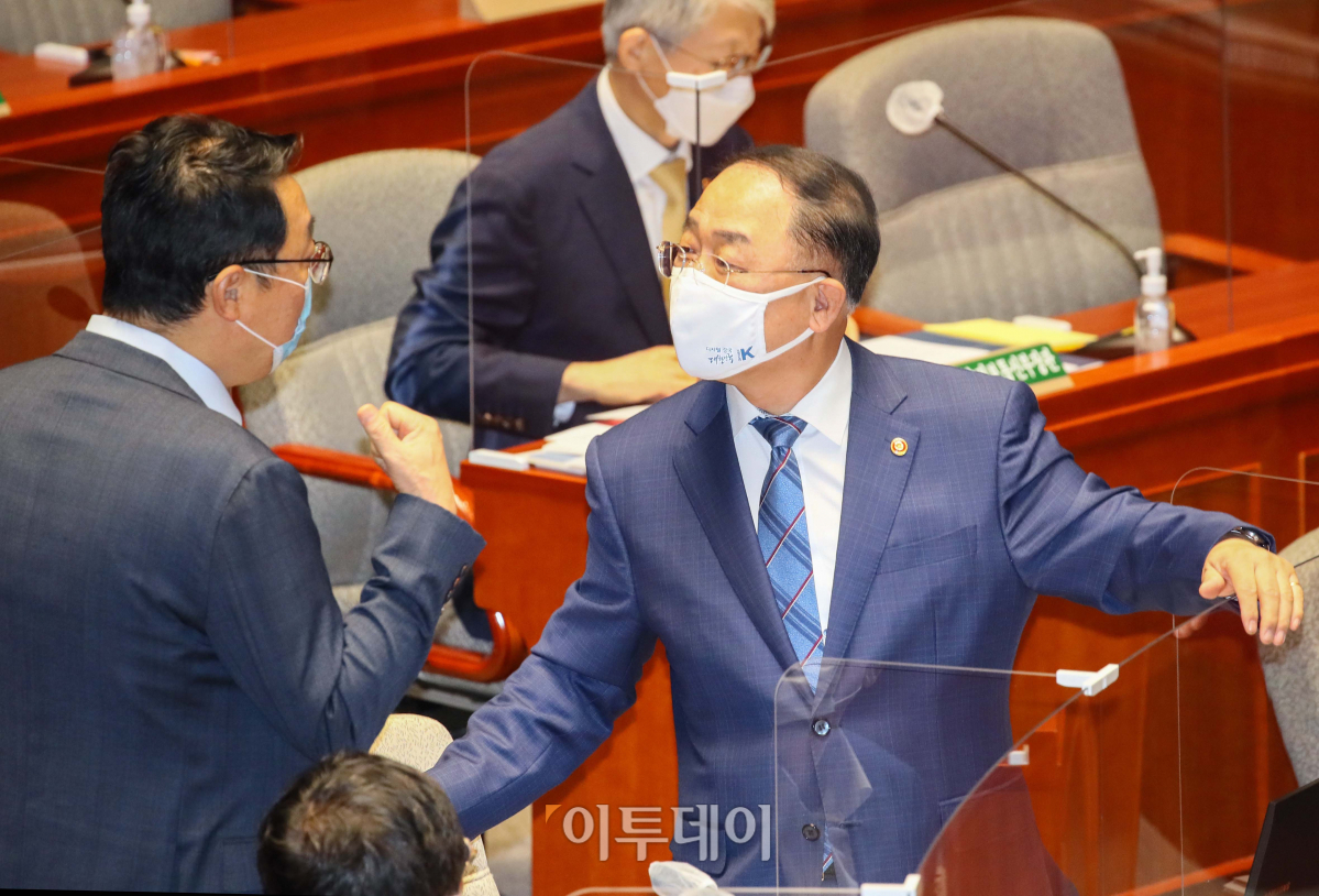 홍남기 경제부총리가 18일 국회 예산결산특별위원회 전체회의에서 더불어민주당 윤영찬 의원과 대화하고 있다.