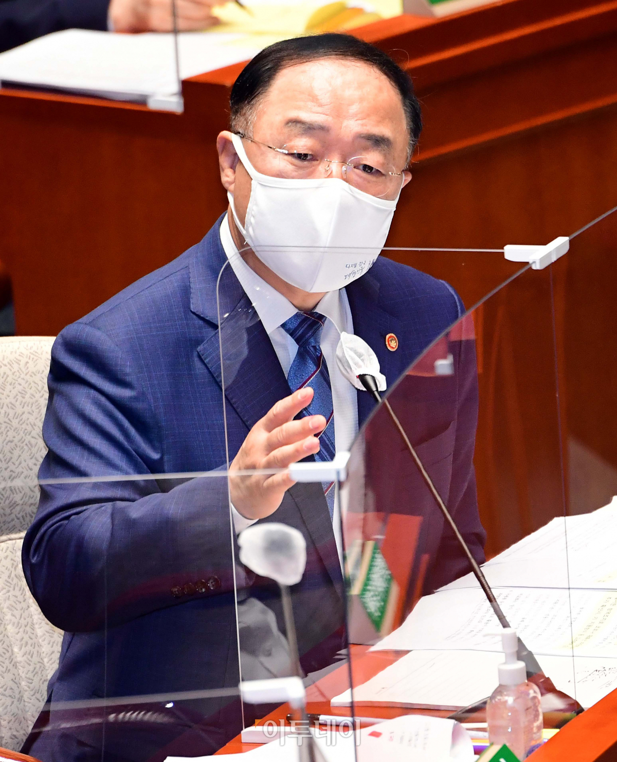 홍남기 경제부총리 겸 기획재정부 장관이 18일 국회에서 열린 예산결산특별위원회 전체회의에 출석해 의원들의 질의에 답변하고 있다. 국회 예산결산특별위원회는 오늘 전체회의에서 정부를 상대로 종합정책질의를 열고 7조8천억원 규모의 4차 추가경정예산안에 대한 본격적인 심사에 착수 한다.
