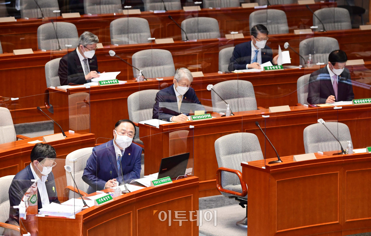 홍남기 경제부총리 겸 기획재정부 장관이 18일 국회에서 열린 예산결산특별위원회 전체회의에 출석해 의원들의 질의에 답변하고 있다. 국회 예산결산특별위원회는 오늘 전체회의에서 정부를 상대로 종합정책질의를 열고 7조8천억원 규모의 4차 추가경정예산안에 대한 본격적인 심사에 착수 한다.