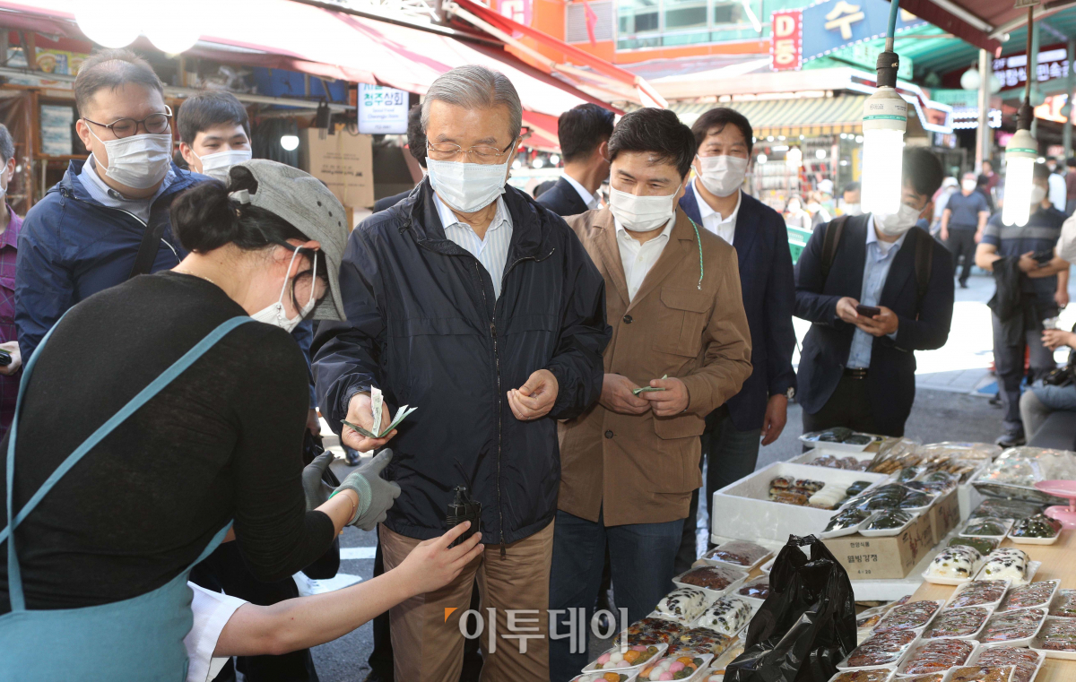김종인 국민의힘 비상대책위원장이 18일 오전 서울 중구 남대문시장을 찾아 상인들과 대화를 하고 있다.