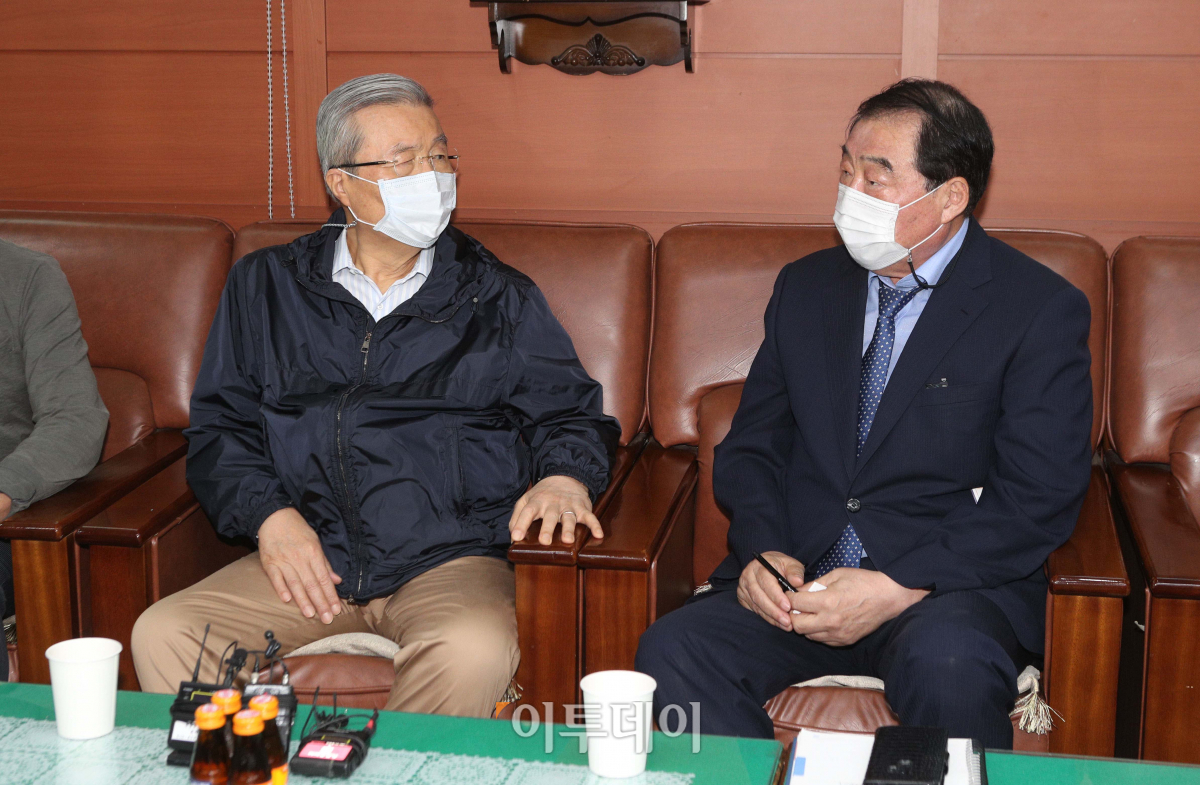 김종인 국민의힘 비상대책위원장이 18일 오전 서울 중구 남대문시장을 찾아 상인들과 간담회를 갖고 있다. 오른쪽은 박영철 남대문관광특구 회장.