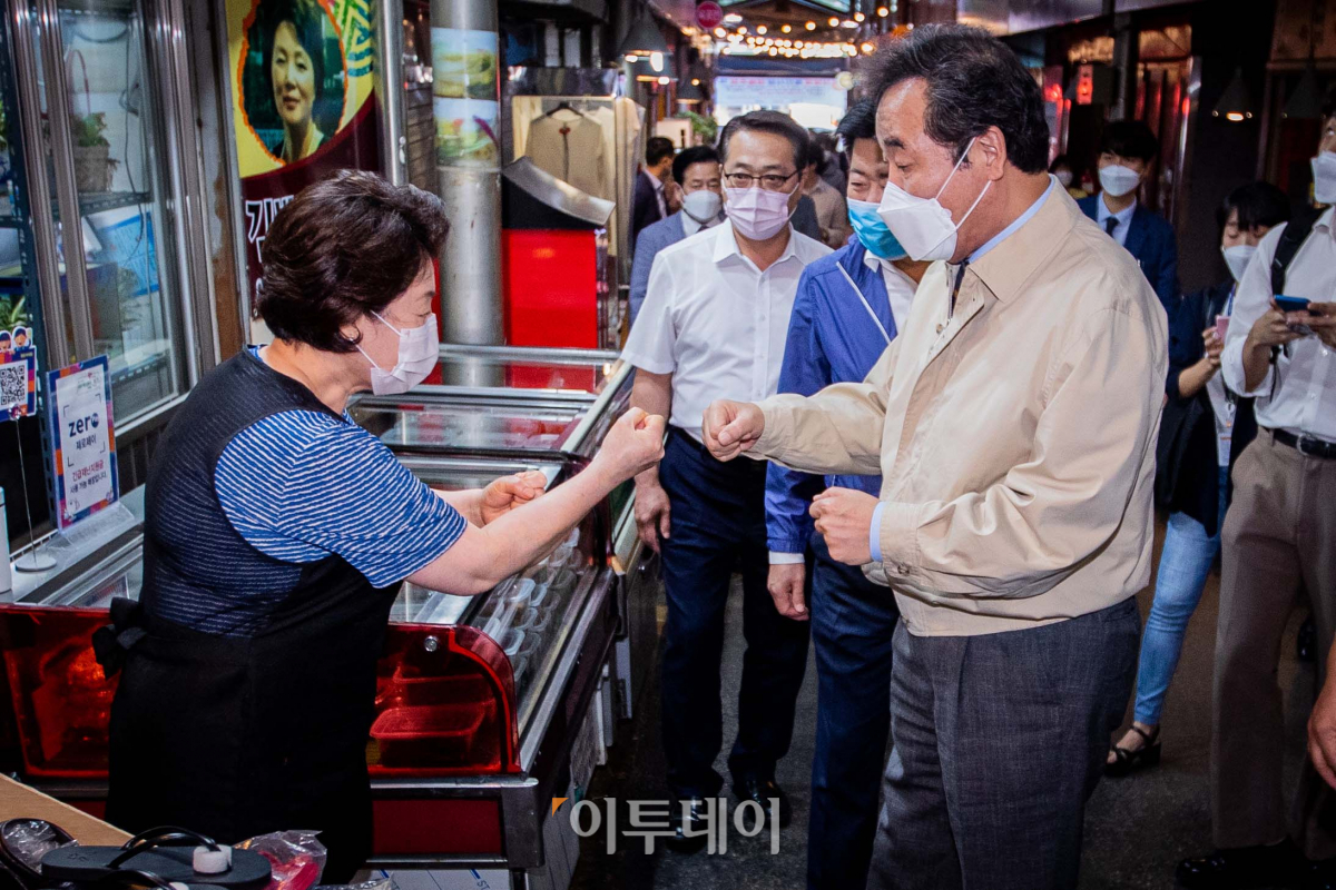 더불어민주당 이낙연 대표가 18일 오후 서울 종로구 통인시장 방문해 상인들과 주먹인사를 하고 있다.