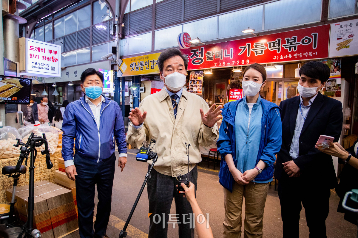 더불어민주당 이낙연 대표가 18일 오후 서울 종로구 통인시장 방문을 마치고 기자들의 질문에 답변하고 있다.