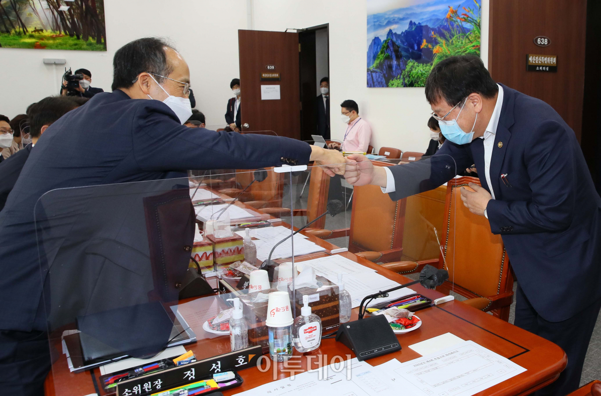 국민의힘 추경호 간사와 안일환 기획재정부 2차관이 21일 국회에서 열린 예산결산특별위원회 제4회 추경예산안등조정소위원회에서 인사하고 있다.