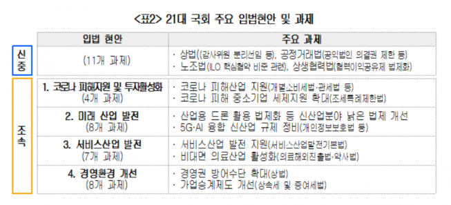 이에 따라 상의는 리포트를 통해 기업경영에 중대한 영향이 예상되는 11개 신중 논의 과제(13개 법안)를 선별해 경제계 의견과 대안을 제시했다. 또한, △코로나 피해지원 및 투자 활성화 △미래산업 발전 △서비스산업 발전 △기업경영환경 개선 등 4대 부문 27개 조속 입법과제(41개 법안)에 대한 의견도 함께 전달했다.
