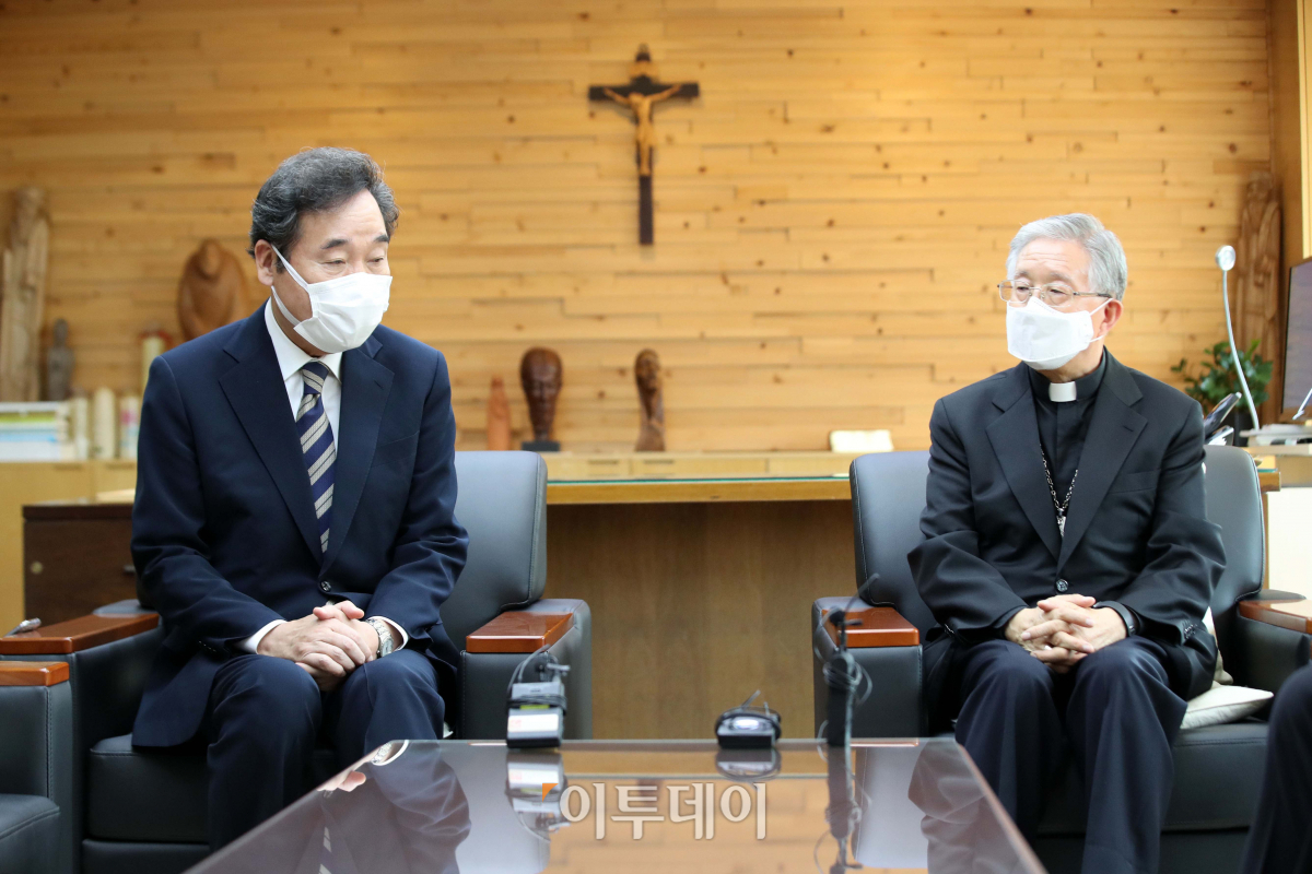 이낙연 더불어민주당 대표가 21일 서울 광진구 한국천주교주교회의를 예방해 주교회의 의장인 김희중 대주교와 면담을 하고 있다.