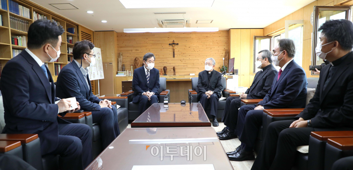 이낙연 더불어민주당 대표가 21일 서울 광진구 한국천주교주교회의를 예방해 주교회의 의장인 김희중 대주교와 면담을 하고 있다.