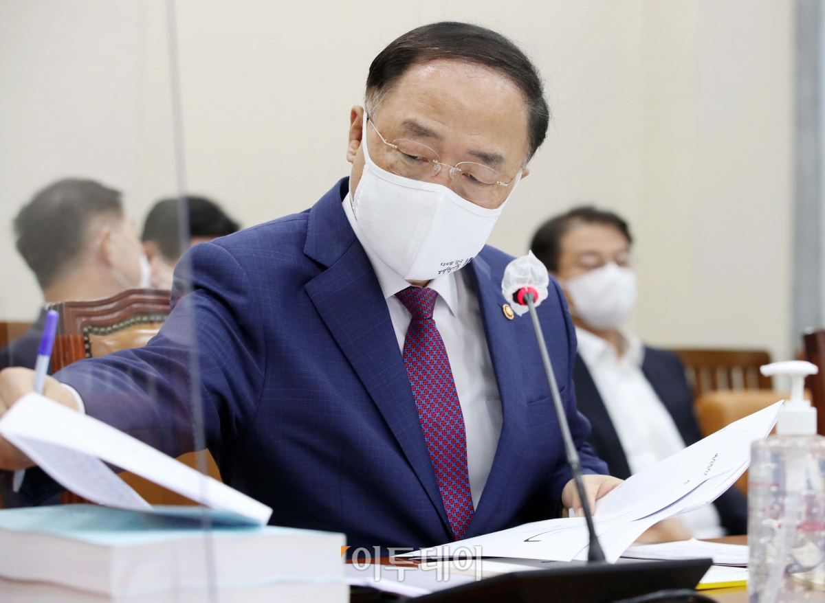 홍남기 부총리 겸 기획재정부 장관이 21일 서울 여의도 국회에서 열린 기획재정위원회 전체회의에서 자료를 확인하고 있다.
