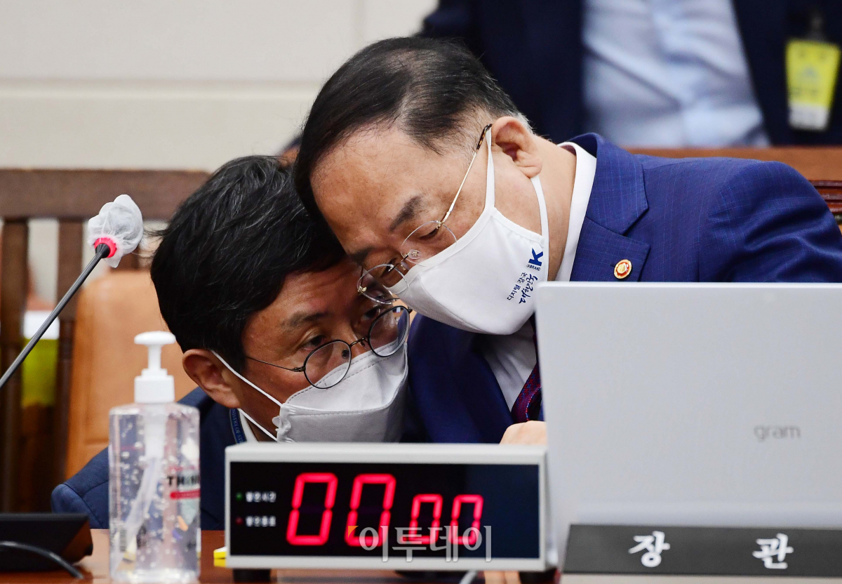 홍남기 경제부총리 겸 기획재정부 장관이 21일 국회에서 열린 기획재정위원회 전체회의에서 관계자와 대화를 나누고 있다.