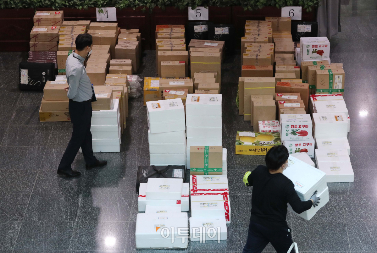 추석 연휴를 열흘여 앞둔 21일 서울 여의도 국회 의원회관 로비에 의원들 앞으로 도착한 각종 명절 선물 택배가 쌓여 있다.