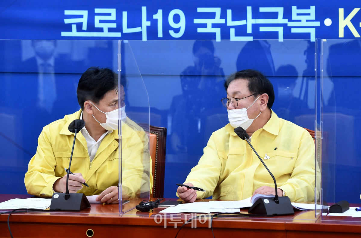 김태년(오른쪽) 더불어민주당 원내대표와 김영진 원내수석부대표가 22일 서울 여의도 국회에서 열린 더불어민주당 원내대책회의에서 대화하고 있다.