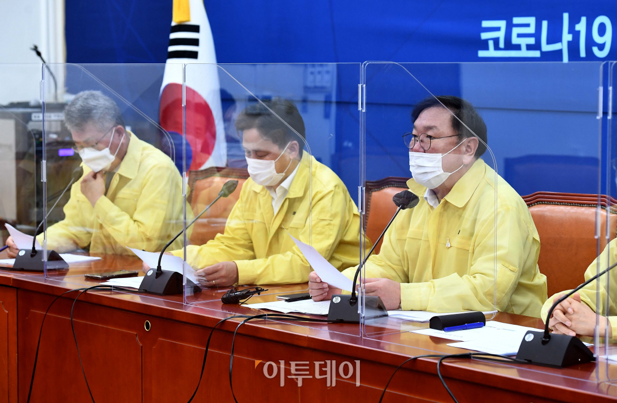 김태년 더불어민주당 원내대표가 22일 서울 여의도 국회에서 열린 더불어민주당 원내대책회의에서 모두발언을 하고 있다.