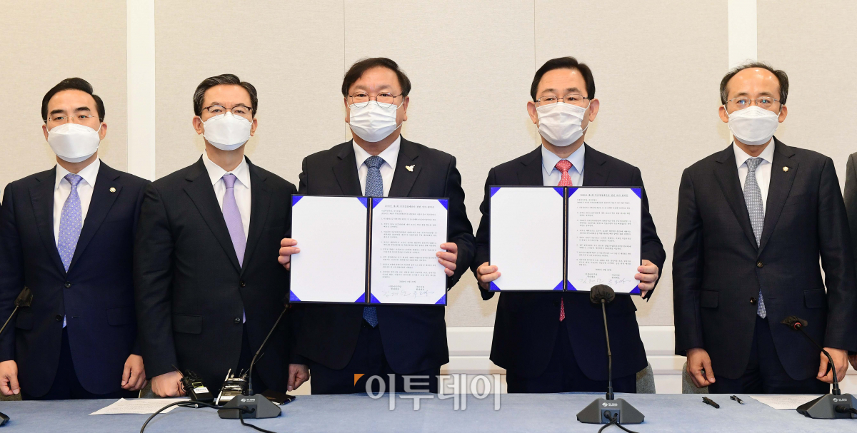 김태년 더불어민주당 원내대표와 주호영 국민의힘 원내대표가 22일 국회에서 2020년도 제4차 추가경정예산안 합의사항 발표에서 합의문에 서명한 후 합의문을 들고 포즈를 취하고 있다. 왼쪽부터 박홍근 더불어민주당 예결위 간사, 정성호 국회 예결위원장, 김태년 더불어민주당 원내대표, 주호영 국민의힘 원내대표, 추경호 예결위 간사.