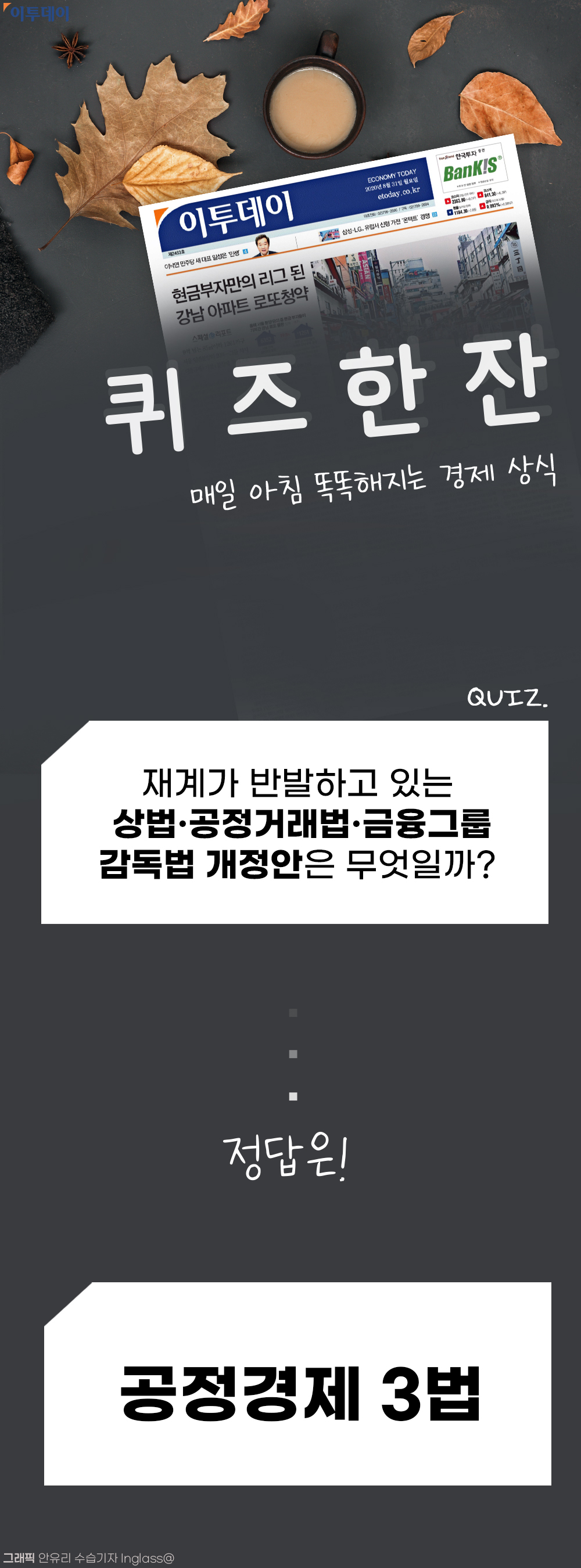 ‘퀴즈한잔’은 매일 한 문제씩 이투데이와 함께하는 경제 상식 퀴즈입니다! 매일 아침 커피 한 잔을 마시듯 퀴즈를 풀며 경제 상식을 키워나가세요!