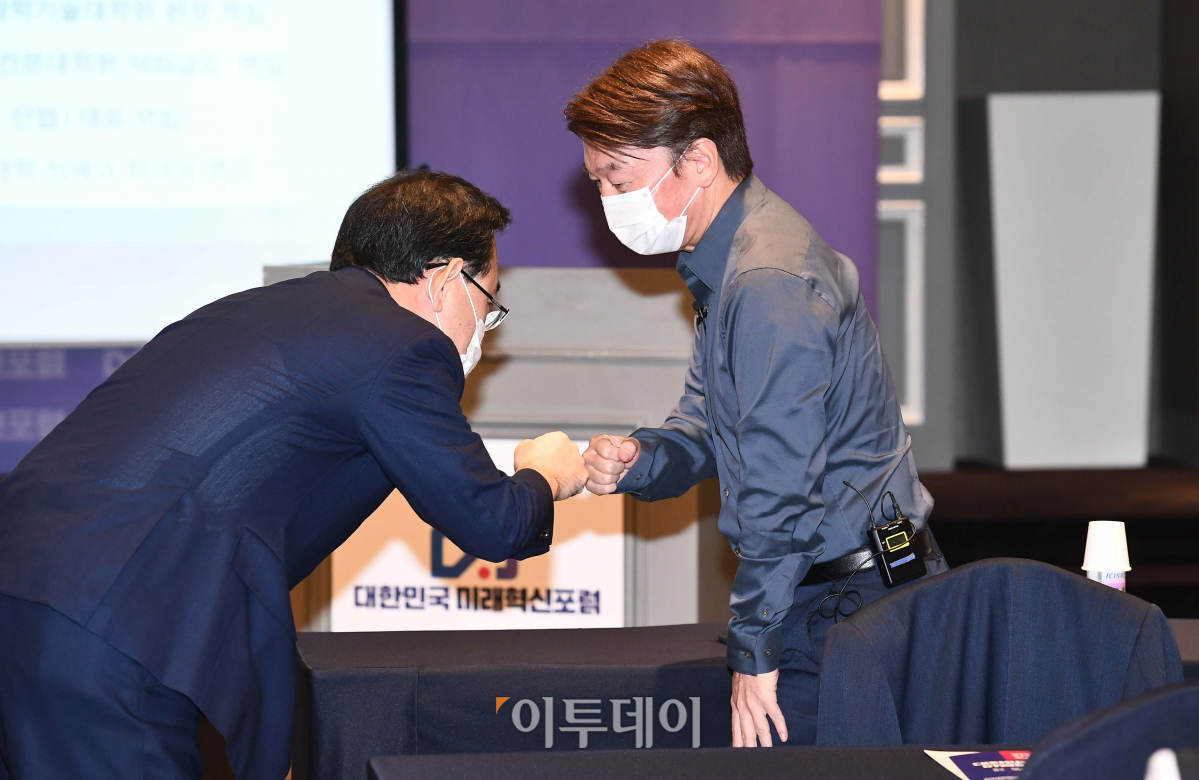 안철수(오른쪽) 국민의당 대표와 주호영 국민의힘 원내대표가 23일 서울 여의도 켄싱턴호텔에서 ‘대한민국의 미래와 야권의 혁신과제’를 주제로 열린 ‘대한민국 미래혁신포럼’에서 인사하고 있다.