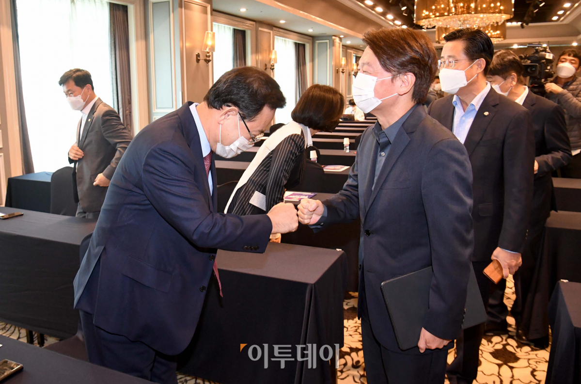 안철수(오른쪽) 국민의당 대표와 주호영 국민의힘 원내대표가 23일 서울 여의도 켄싱턴호텔에서 ‘대한민국의 미래와 야권의 혁신과제’를 주제로 열린 ‘대한민국 미래혁신포럼’에 앞서 인사하고 있다.
