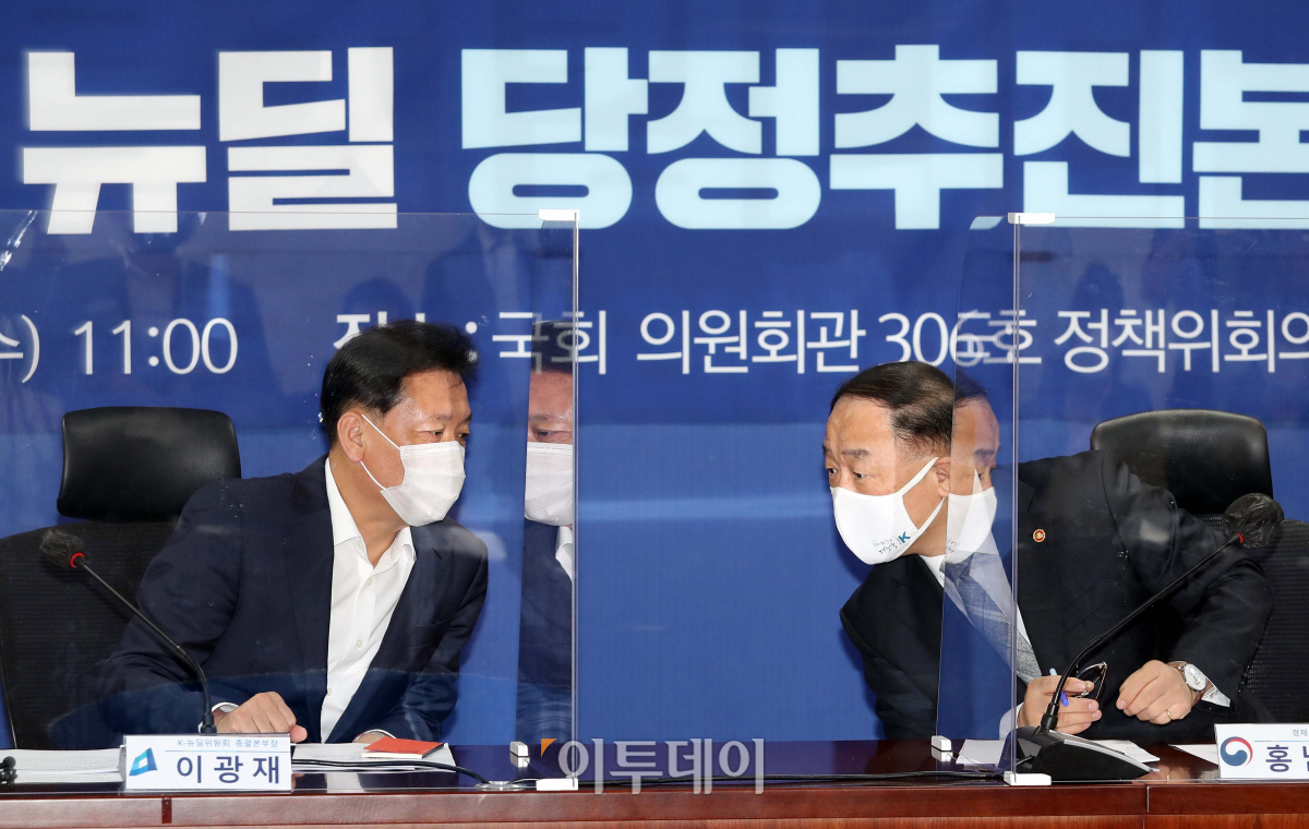 이광재 더불어민주당 K-뉴딜위원회 총괄본부장과 홍남기 경제부총리가 23일 국회 의원회관에서 열린 제2차 한국판 뉴딜 당정 추진본부 회의에서 대화를 하고 있다.