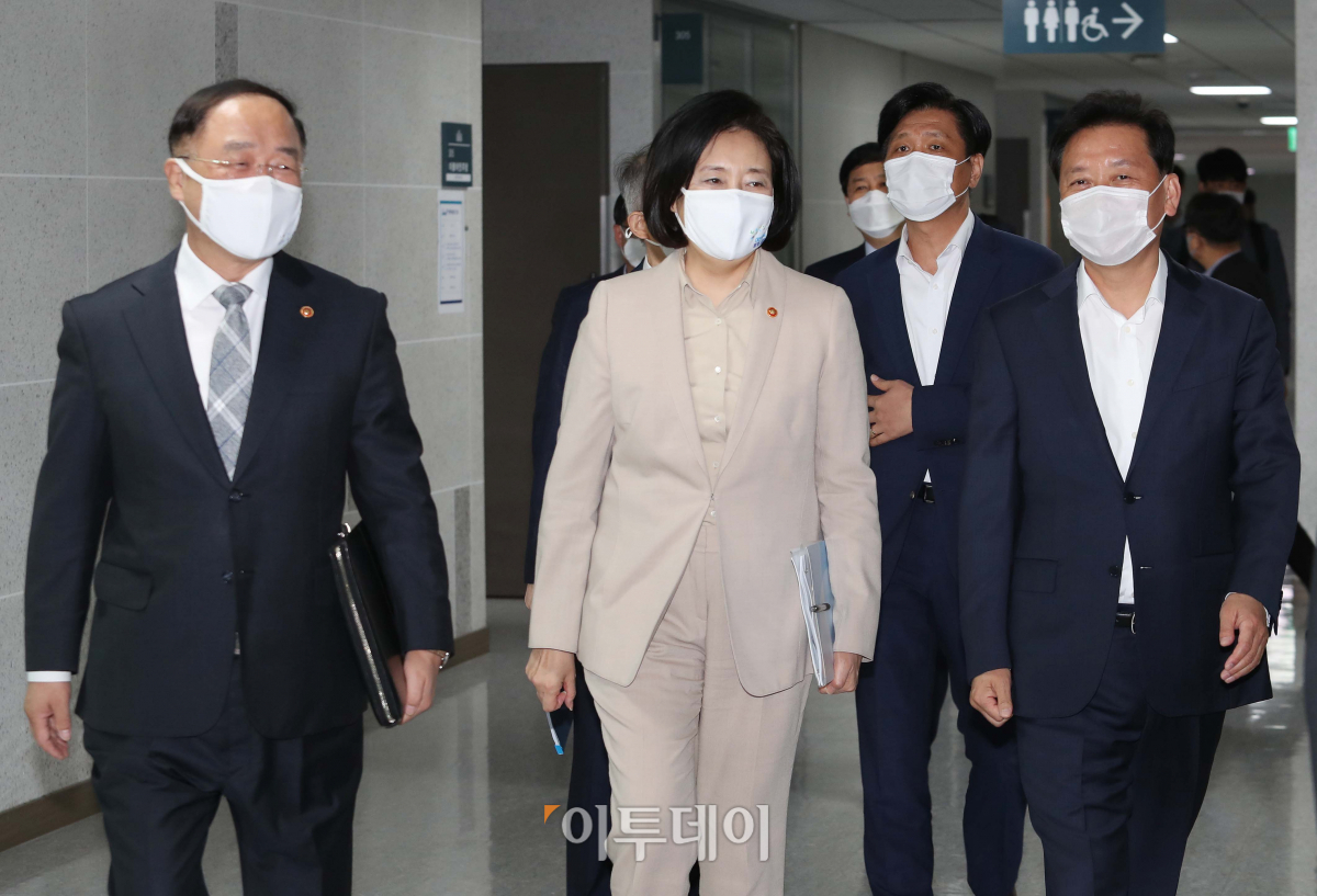 [포토] K뉴딜 당정 추진 회의 참석하는 홍남기-박영선-이광재
