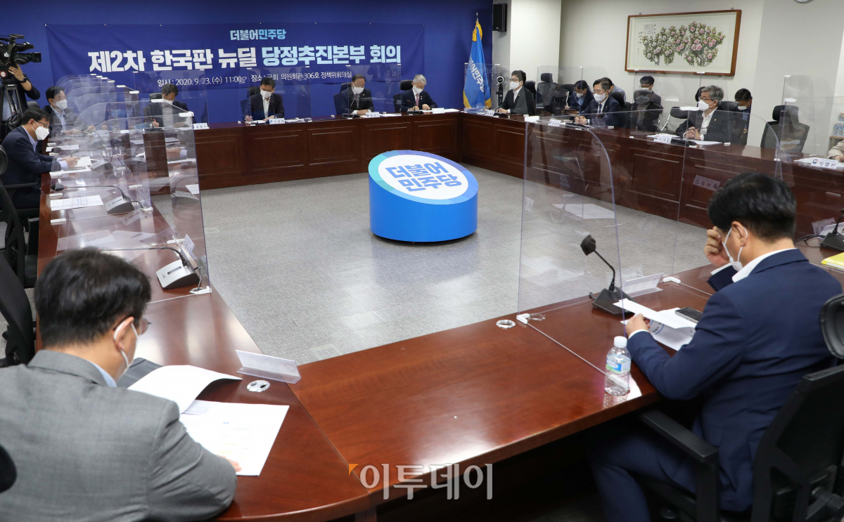 23일 국회 의원회관에서 이광재 더불어민주당 K-뉴딜위원회 총괄본부장과 홍남기 경제부총리 등이 참석한 가운데 제2차 한국판 뉴딜 당정 추진본부 회의가 진행되고 있다.