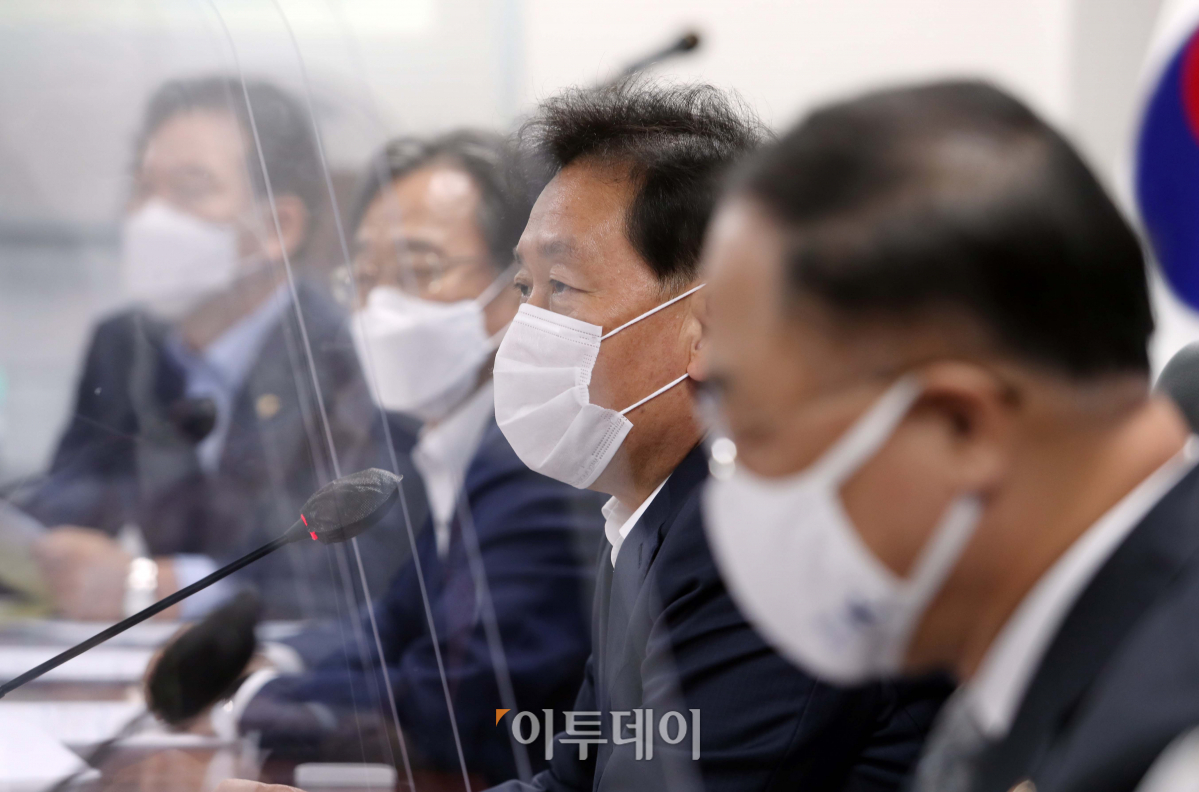 이광재 더불어민주당 K-뉴딜위원회 총괄본부장이 23일 국회 의원회관에서 열린 제2차 한국판 뉴딜 당정 추진본부 회의에서 발언을 하고 있다.